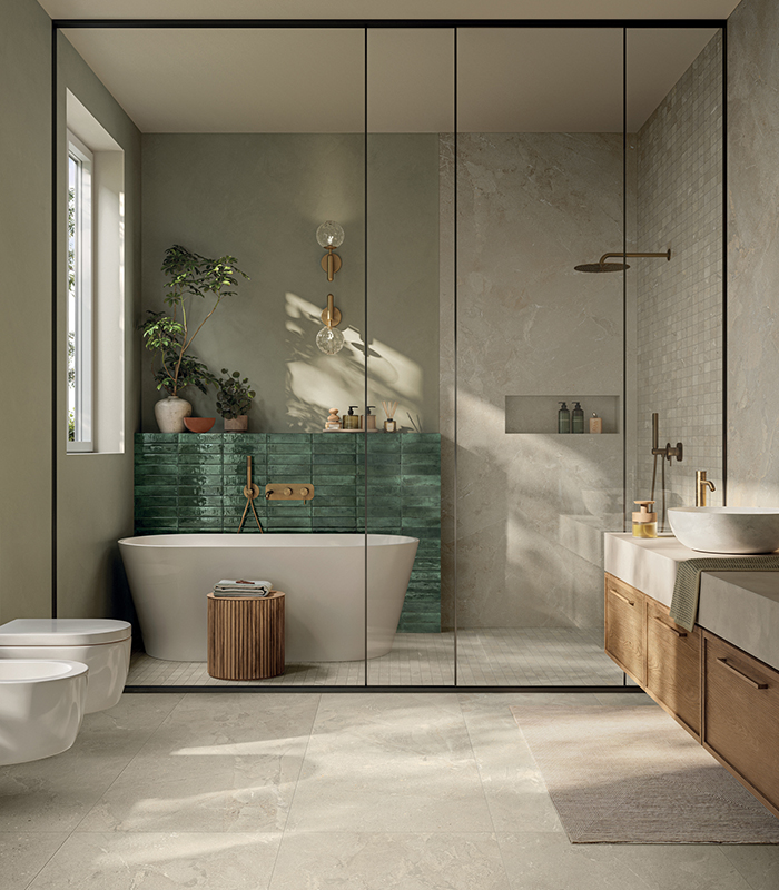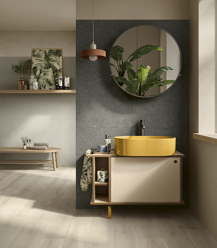 Aside from furniture, accessories, finishes, and textiles, the choice of flooring and wall cladding definitely plays a key role in setting the overall mood and tone of any room. A particularly effective solution is porcelain stoneware, thanks to its inherent qualities and wide range of styles and finishes. A wood-look stoneware floor paired with marble-look wall cladding, creates an elegant and sophisticated contrast. Likewise, cement-look stoneware conveys an industrial and contemporary vibe which can be softened and enhanced with warm wood accents. The versatility of this material allows for the creation of unique, customised designs that adapt to both traditional and modern interiors.