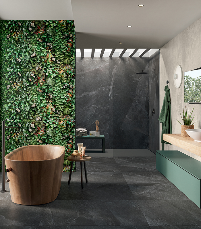 The new large format (120x278cm) in the Zero.3 Stone Trace collection enhances the impression of continuous surfaces by covering rooms like a second skin through a ceramic interpretation of slate.
