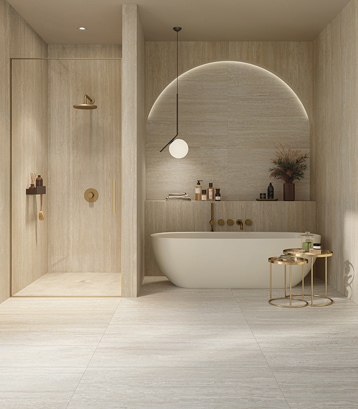 Perpetual is born from the continuous dialogue between memory and vision, where the material – through different inspirations rooted in stone aesthetics – renews itself over time and becomes an expression of style. In this material narrative, the introduction of vein-cut travertine represents the natural evolution of the collection in the name of contemporaneity.