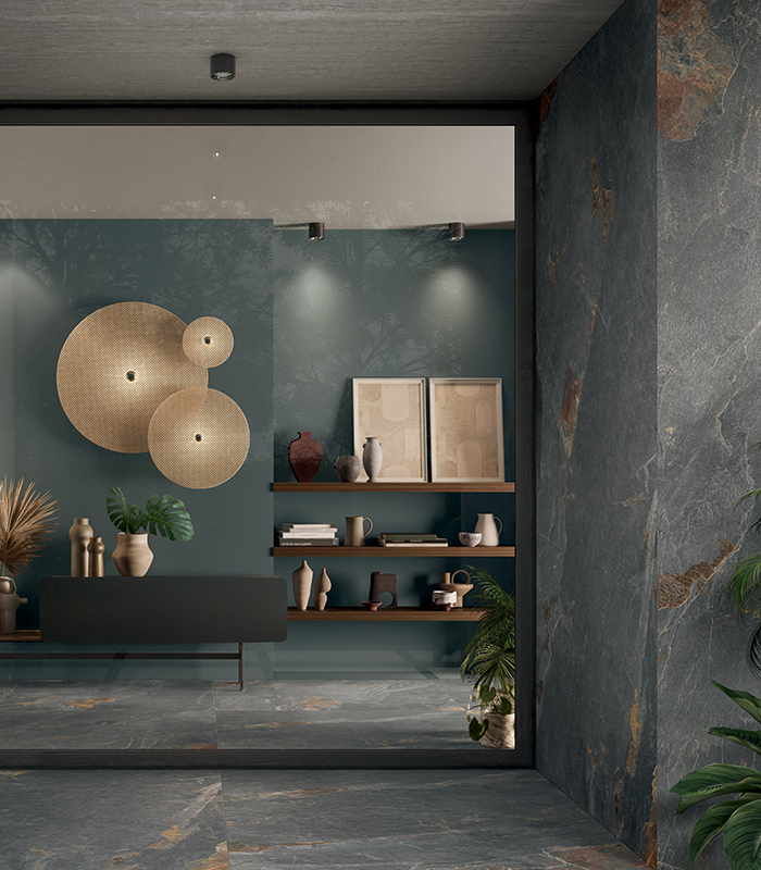 Stone Trace features a stone effect that reproduces, with perfect fidelity, the natural allure and the stylistic impact of slate. The intense colour and the original surface shades make it a versatile collection with a tactile appeal and distinctive tones that are bold, yet discreet, creating a perfect setting for contemporary interior furnishing elements.