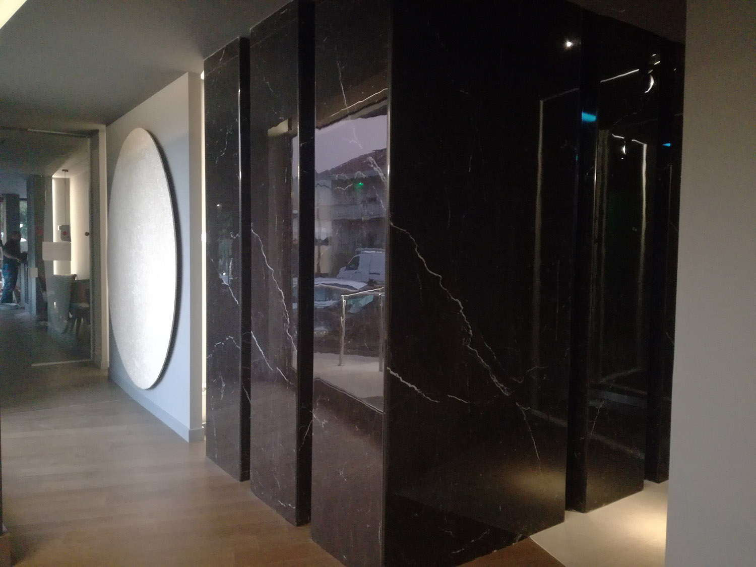 Panaria Ceramica has made a significant contribution to the wellness area and spa, where the Prime Stone collection is the star attraction: tiles in the Greige Prime shade have been used on the outside, while the Silver Prime colour is on show inside. It is a line of stone-effect floor coverings that strikingly blends with the contemporary concrete surfaces, giving the room a distinctly modern look with naturally authentic “vintage” references. The surfaces selected for the spa and poolside flooring are specially designed to offer the right level of grip and resistance to weathering, water absorption, chlorine and chemical agents – outdoors – or moisture and heat, as well as detergents and disinfectants, for the wellness area’s indoor spaces. A touch of intense relaxation, mystery and charm is provided by the dark Marquina Black shade of the Eternity large ceramic slab collection, which makes the spa environment a sanctuary where you can totally unwind. This collection represents a selection of the finest marble that nature has to offer, which is transformed into durable and versatile slim laminated porcelain stoneware surfaces.